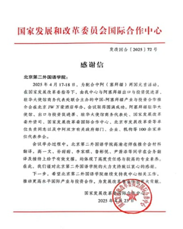 The NDRC International Cooperation Center expressed their gratitude in a letter, acknowledging the students' international competence and cross-cultural communication skills, which once again demonstrate the remarkable results of BISU's foreign language talent cultivation.